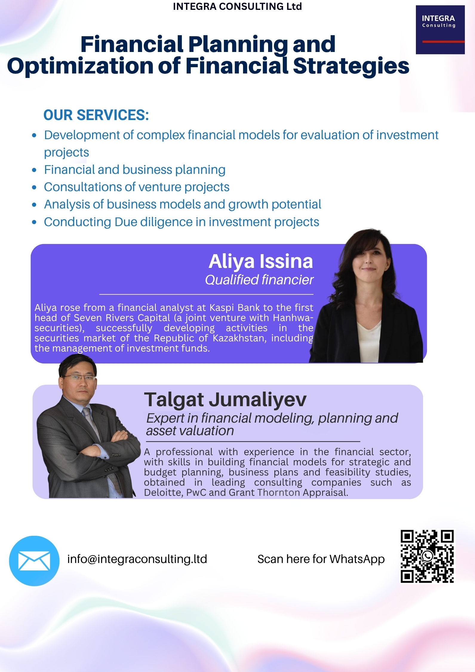 What sets Integra Consulting apart from other consulting firms? Integra Consulting stands out due to our leadership team’s unique combination of senior regulatory backgrounds and extensive experience in global finance, compliance, and insurance. With former executives from the Central Bank of Kazakhstan, Deutsche Bank, JPMorgan Chase, and leading insurance companies, we bring a level of insight and expertise that positions us as unparalleled in the consulting market. Their expertise spans regulation, investment banking, corporate governance, and involvement in major investment deals and IPOs, enabling us to deliver practical, trusted solutions that help clients meet regulatory standards and reach their financial objectives.